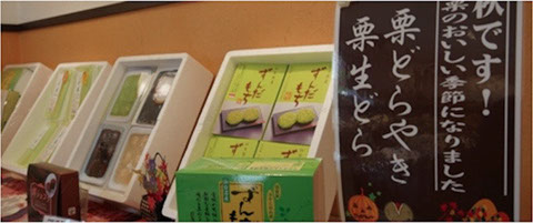お店では、全国的にも有名なった、甘く枝豆の大地の風味と、程よい食感が更に美味しさを引き出している、mちべえ自慢の「ずんだ持ち」をはじめ、くるみ・ごま・あんこの4種類のお持ちの他、生どらやお米の純正ロール(ずんだ)、ゆべしなどの和菓子などの商品がたくさん揃っているので、1000種類食べたくなる和菓子好きにオススメのお店です。
