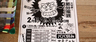 とってもお得な福袋が限定販売するほか、空くじなしの福引!1等賞は『パパ好み1ケース(80袋)』や『ギフト券または、松倉商品券』が当たるほか、鬼さんと記念撮影!などお楽しみがいっぱい♫